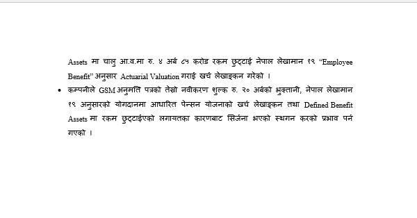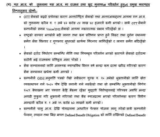 कम्पनीले अनुमति पत्रको तेस्रो नवीकरण शुल्क रु. २० अर्बको भुक्तानीको लागि स्रोत व्यवस्थापन गर्न २०८० पौष देखि लगानी गर्न नसकेको तथा सो सम्बन्धि भुक्तानीको निर्णय २०८१ बैशाखमा भए पश्चात केहि बैंकमा रहेका मुद्दती निक्षेपहरुलाई परिपक्व अवधि भन्दा अगाडी फुकुवा गरि भुक्तानी गरिएको तथा बैंक ब्याजदरमा भएको परिवर्तनका कारण वित्तीय आम्दानी करिब रु. १ अर्ब २९ करोड ७३ लाखले कमी भएको ।