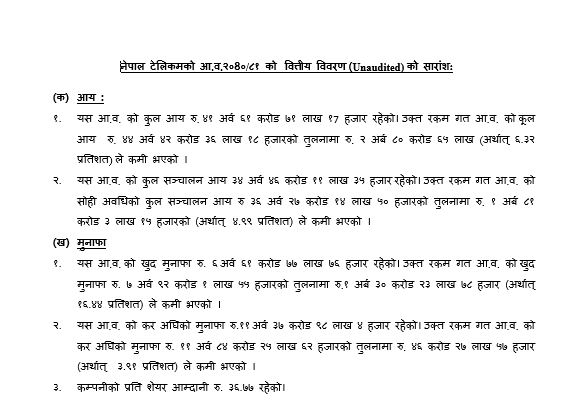 उक्त रकम गत आ.व. को कूल आय रु. ४४ अर्व ४२ करोड ३६ लाख १८ हजारको तुलनामा रु. २ अर्ब ८० करोड ६५ लाख (अर्थात् ६.३२ प्रतिशत) ले कमी भएको हो । टेलिकमको आ.व. को कुल सञ्चालन आय ३४ अर्व ४६ करोड ११ लाख ३५ हजार रहेको छ । उक्त रकम गत आ.व. को सोही अवधिको कुल सञ्चालन आय रु ३६ अर्व २७ करोड १४ लाख ५० हजारको तुलनामा रु १ अर्ब ८१ करोड ३ लाख १५ हजारको (अर्थात् ४.९९ प्रतिशत) ले कमी भएको टेलिकमले जारी गरेको विज्ञप्तीमा उल्लेख गरिएको छ ।