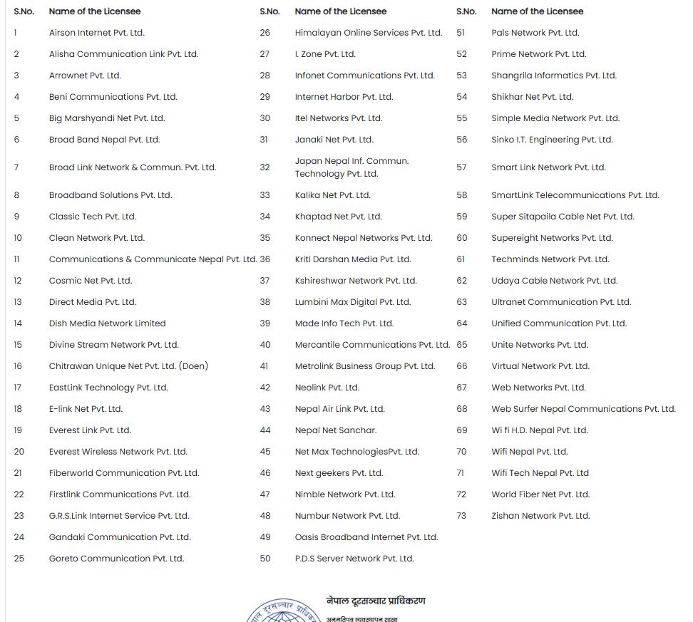 पटक पटक पत्राचार, इमेल तथा सूचनामार्फत जानकारी गराउादा समेत विवरणसहित बाँकी बक्यौता रकम दाखिला गरी जानकारी नगराएको प्राधिकरणले सूचनामा उल्लेख गरेको छ । सूचनाअनुसार ७३ आईएसपीहरुले ७ गतेदेखि हुने १५ दिनको समयमै नियमानुसारको विवरण, कागजातसहित बाँकी बक्यौता रकम भुक्तानी गरी प्राधिकरणमा जानकारी गराउनु पर्नेछ । त्यसो नगरिए दूरसञ्चार ऐन २०५३ अनुसार कारबाही अघि बढाउने प्राधिकरणको चेतावनी छ ।