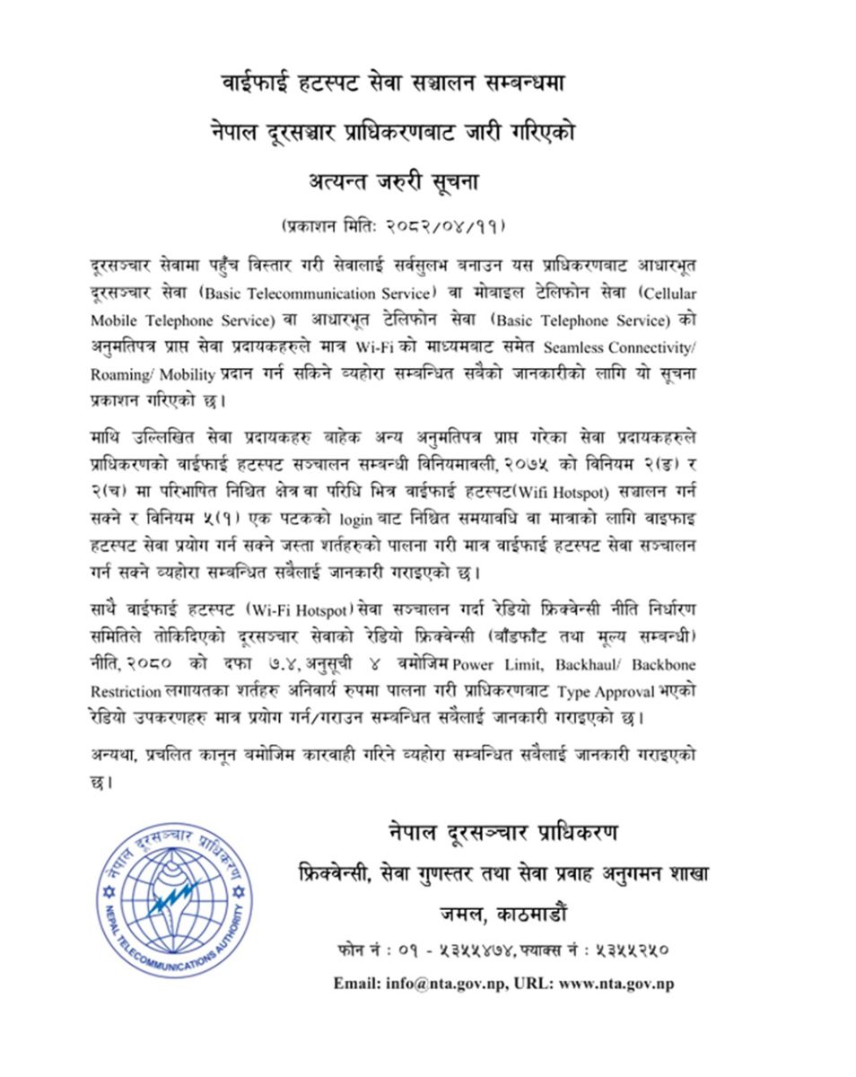 प्राधिकरणले सूचना प्रकाशित दूरसञ्चार सेवामा पहुँच विस्तार गरी सेवालाई सर्वसुलभ बनाउन यस प्राधिकरणवाट आधारभूत दूरसञ्चार सेवा वा मोबाइल टेलिफोन सेवा वा आधारभूत टेलिफोन सेवाको अनुमतिपत्र प्राप्त सेवा प्रदायकहरुले मात्र वाइफाई सेवा प्रदान गर्न सकिने बताएको छ ।