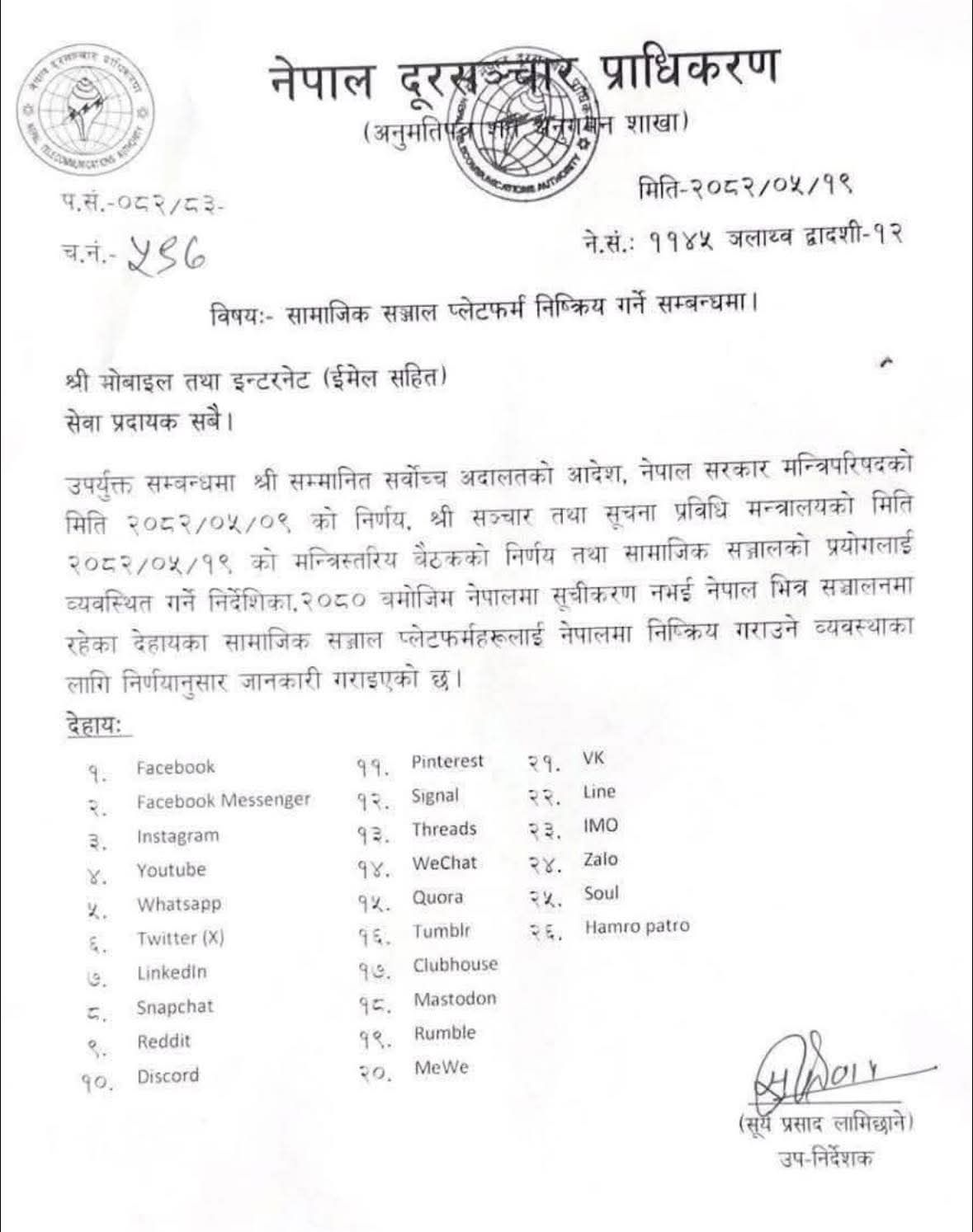 प्राधिकरणले फेसबुक, फेसबुक म्यासेन्जर, इन्स्टाग्राम, युट्युब, ह्वाट्सएप, ट्वीटर (एक्स), लिङ्क्डइन, स्यानपच्याट, रेड्डीट, डिस्कर्ड, पिनट्रेस्ट, सिग्नल, थ्रेड, वीच्याट, कोरा, टम्बलर, क्लबह्वाउस, मास्टोडन, रम्बल, मीवी, भीके, लाइन, इमो, जालो, सोल र हाम्रो पात्रोलाई निष्क्रिय बनाउन निर्देशन दिएको हो ।