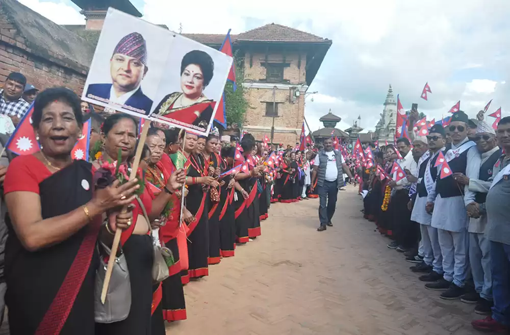 भक्तपुरवासीको निमन्त्रणामा दरबार क्षेत्र पुगेका पूर्वराजा शाहलाई भक्तपुरका स्थानीयले भव्य स्वागत गरेका थिए ।