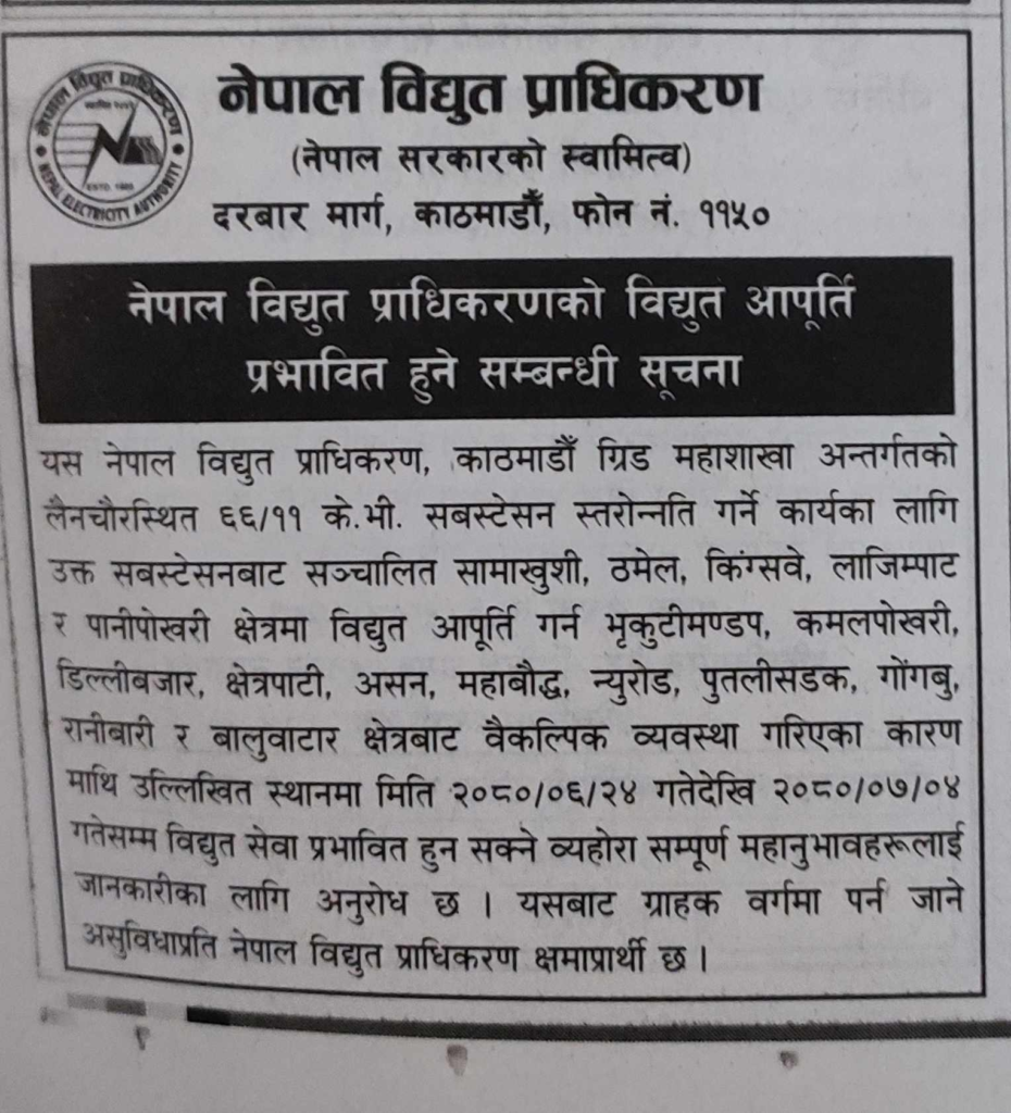 काठमाडौँ ग्रिड महाशाखा अन्तर्गतको लैनचौरस्थित ६६/११ के.भी. सब स्टेसन स्तरोन्नति गर्ने कार्यका लागि उक्त सब स्टेसनबाट सञ्चालित सामाखुसी, ठमेल, लाजिम्पाट र पानी पोखरी क्षेत्रमा विद्युत् आपूर्ति गर्न भृकुटीमण्डप, कमलपोखरी, डिल्लीबजार, क्षेत्र पाटी, असन, महाबौद्ध, न्युरोड, पुतलीसडक, गोङ्गबु, रानीबारी र बालुवाटार क्षेत्रबाट वैकल्पिक व्यवस्था गरिएका कारण विद्युत् आपूर्ति अवरुद्ध हुने जनाएको हो ।