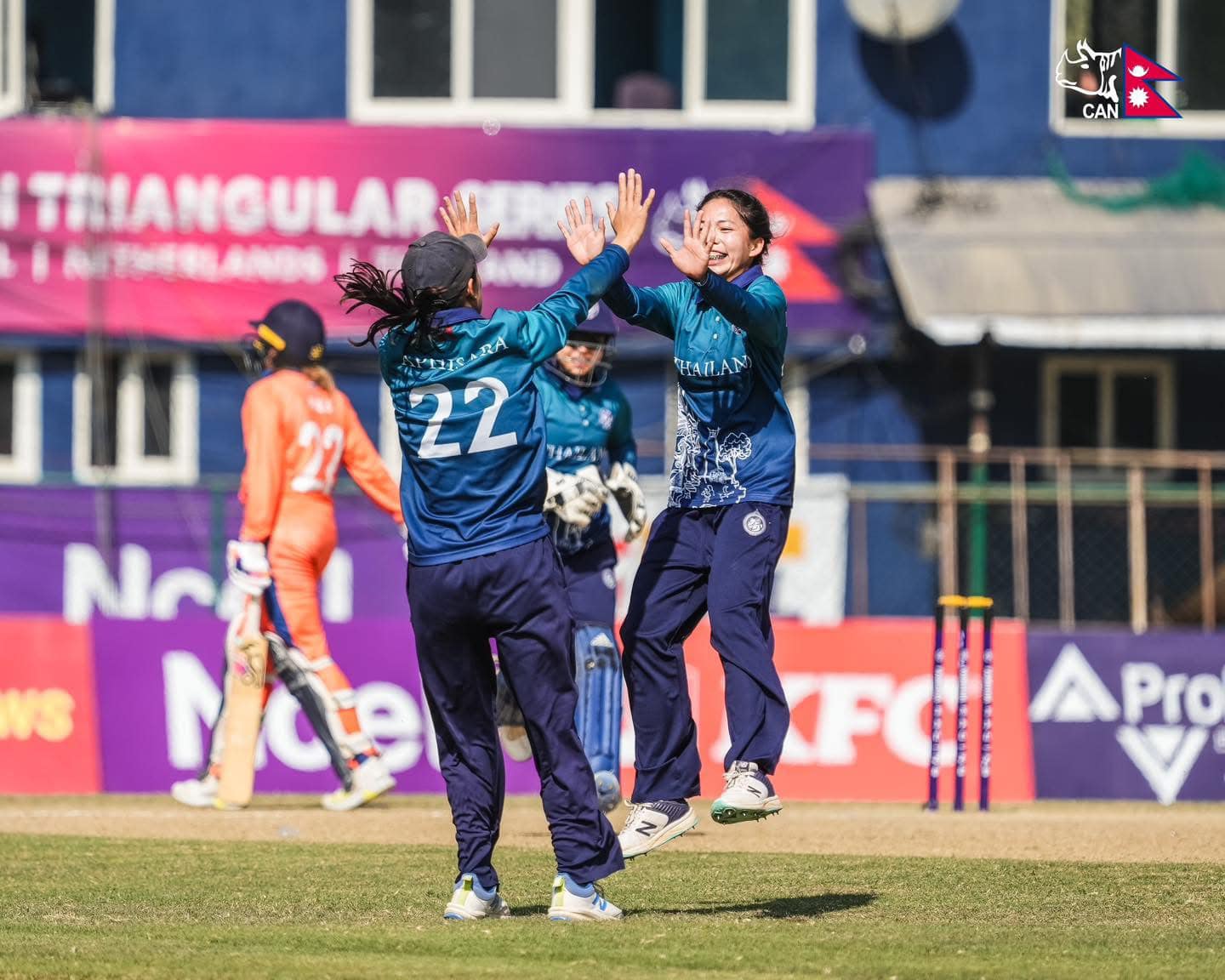 कीर्तिपुरस्थित त्रिवि मैदानमा आज भएको खेलमा ल थाइल्यान्डले दिएको ८७ रनको सामान्य लक्ष्य पछ्याएको नेदरल्यान्ड्स १५ दशमलव ५ ओभरमा ६९ रनमा ‘अल आउट’ भयो । नेदरल्यान्ड्सका लागि कप्तान बाबेटी डी लिडेले सर्वाधिक २५ रन जोडिन् । आइरिस विलिङले १३ रन जोडिन् । यस्तै, क्यारोलिन डी ल्यासले १० रन बनाइन् ।